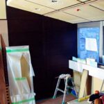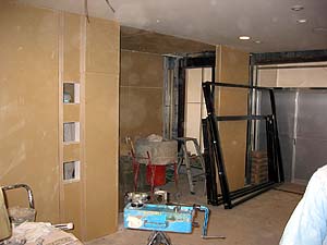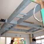 天井部分。黒いラインは、掘り込みになっていて、照明を仕込みます。透かし目地でボードを貼ってる最中です。