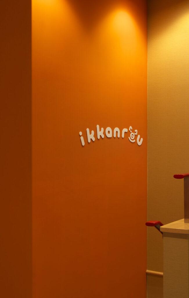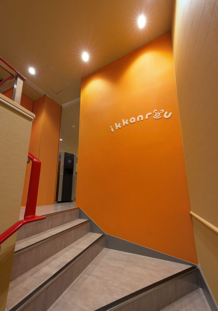 階段を上がって正面にある券売機コーナーに、三宮一貫樓のブランドカラーであるオレンジ色を使用して、空間のアクセントとしました。